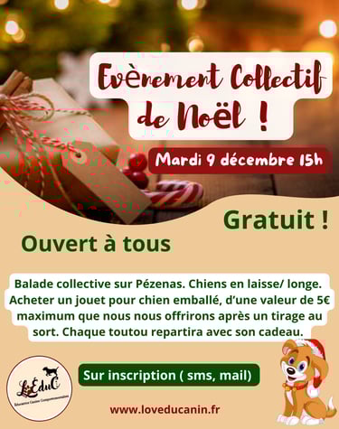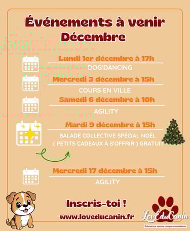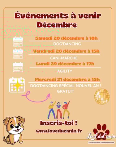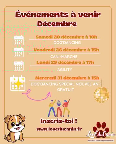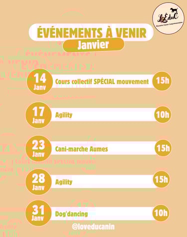 Ici vous trouverez la présentation de l'équipe qui se compose de mes chiens et moi, de mes différentes prestations proposées ainsi que mes différents tarifs, d'une galerie photo ainsi que des évènements qui ont lieu chaque mois, et pour finir mes coordonnées pour me contacter.