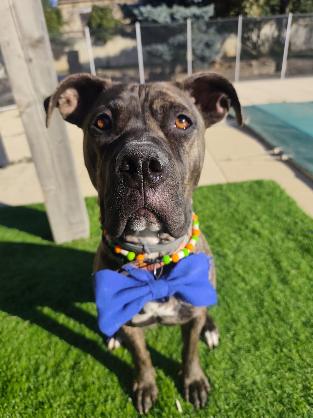 J'accompagne souvent ma maman pour l'aider dans ses cours d'éducations. Mon allure impressionne mais je suis le chien le plus respectueux, patient, j'aime tout le monde, et je prend souvent quelque chose en gueule pour me rassurer.