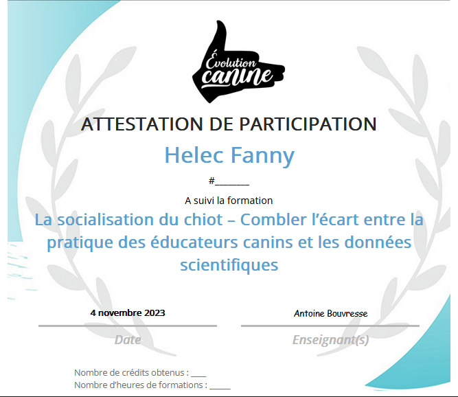Je suis rentrée en formation chez Caniscool, et j'ai obtenu mon Brevet Professionnel d'Educateur Canin Comportementaliste en 2022.
