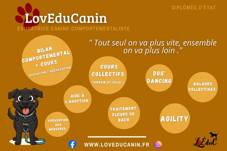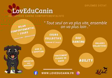 Les prestations peuvent être différentes si les humains souhaitent autre chose ( sois que le bilan et des cours, sois un bilan et des cours collectifs ou sois des cours sport canin privé, ou traitement fleurs de Bach ...).