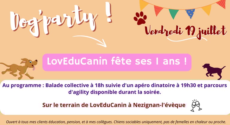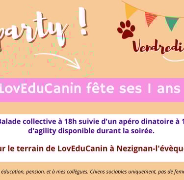 Pour les 1ans de l’entreprise, LovEduCanin vous invite à sa petite soirée qui se déroulera sur son terrain à Nézignan-l’évèque le samedi 6 juillet.