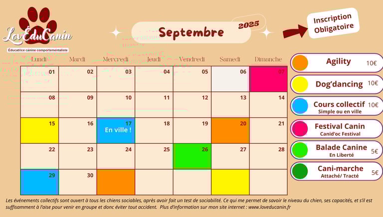 Concernant les cours collectifs sur mon terrain, les chiens seront tous attachés, et il y aura un coin détente uniquement pour les chiens qui sont suffisamment à l'aise pour être en liberté avec des copains, afin d'éviter tout accident.