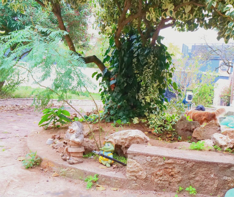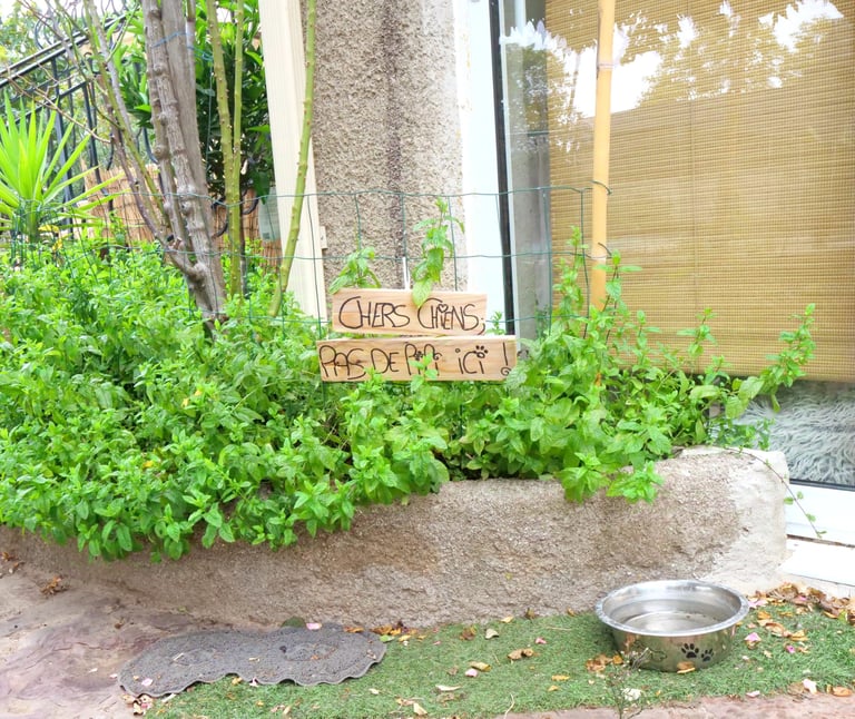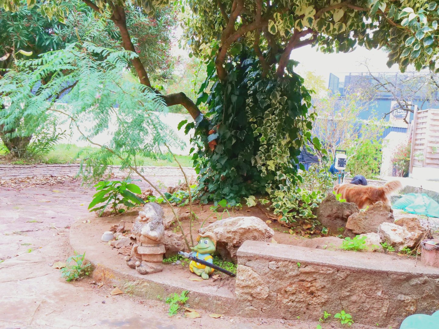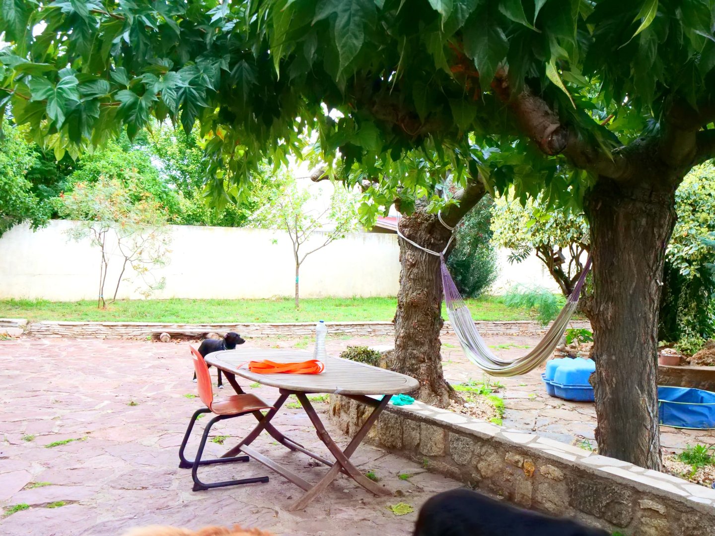 Terrain clôturé et sécurisé. Pelouses, terrasse pratiquement toute la journée à l'ombre pour se mettre au frais.